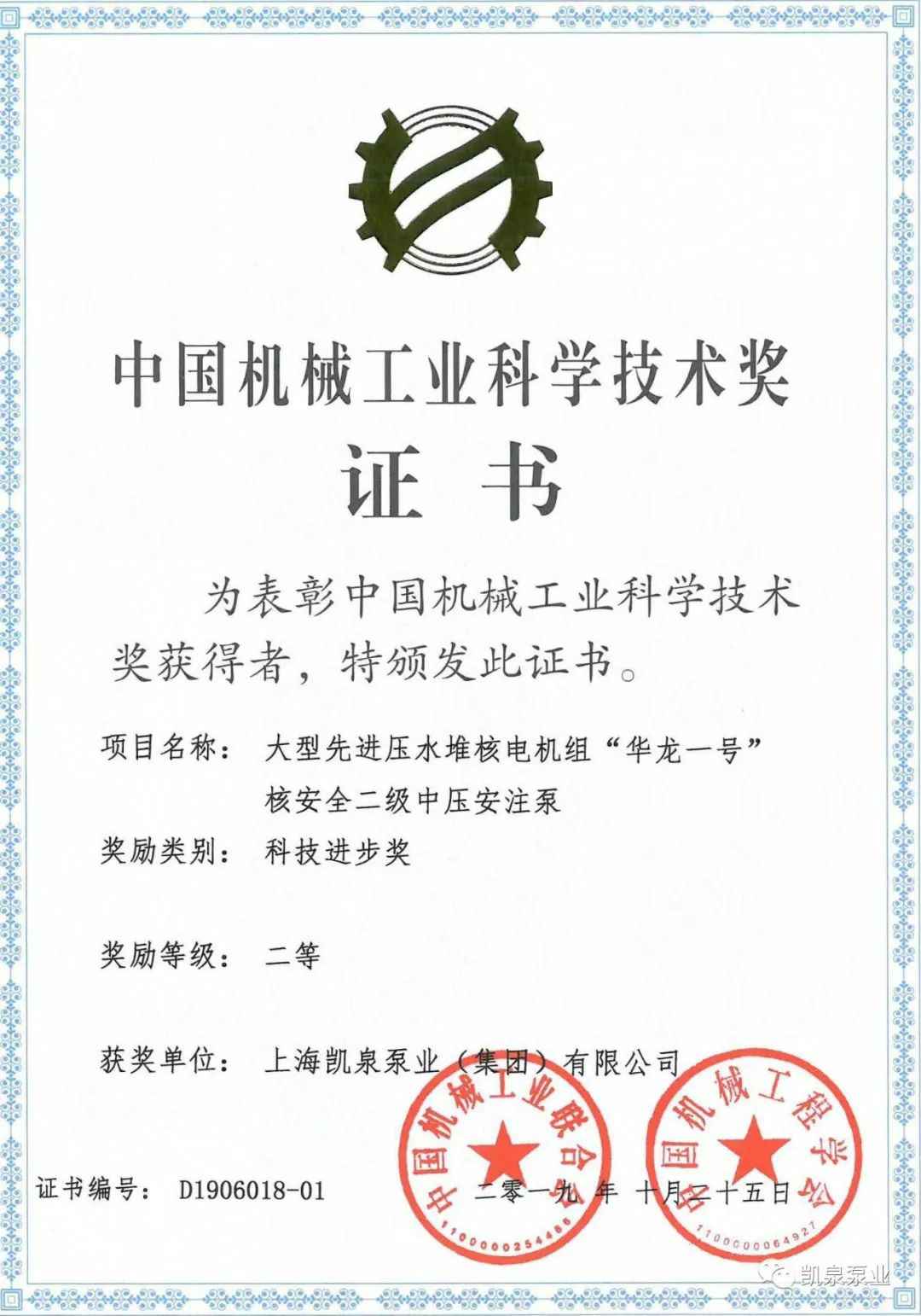 泉州振华铸造技术有限公司荣获“2019年度中国机械工业科学技术奖”